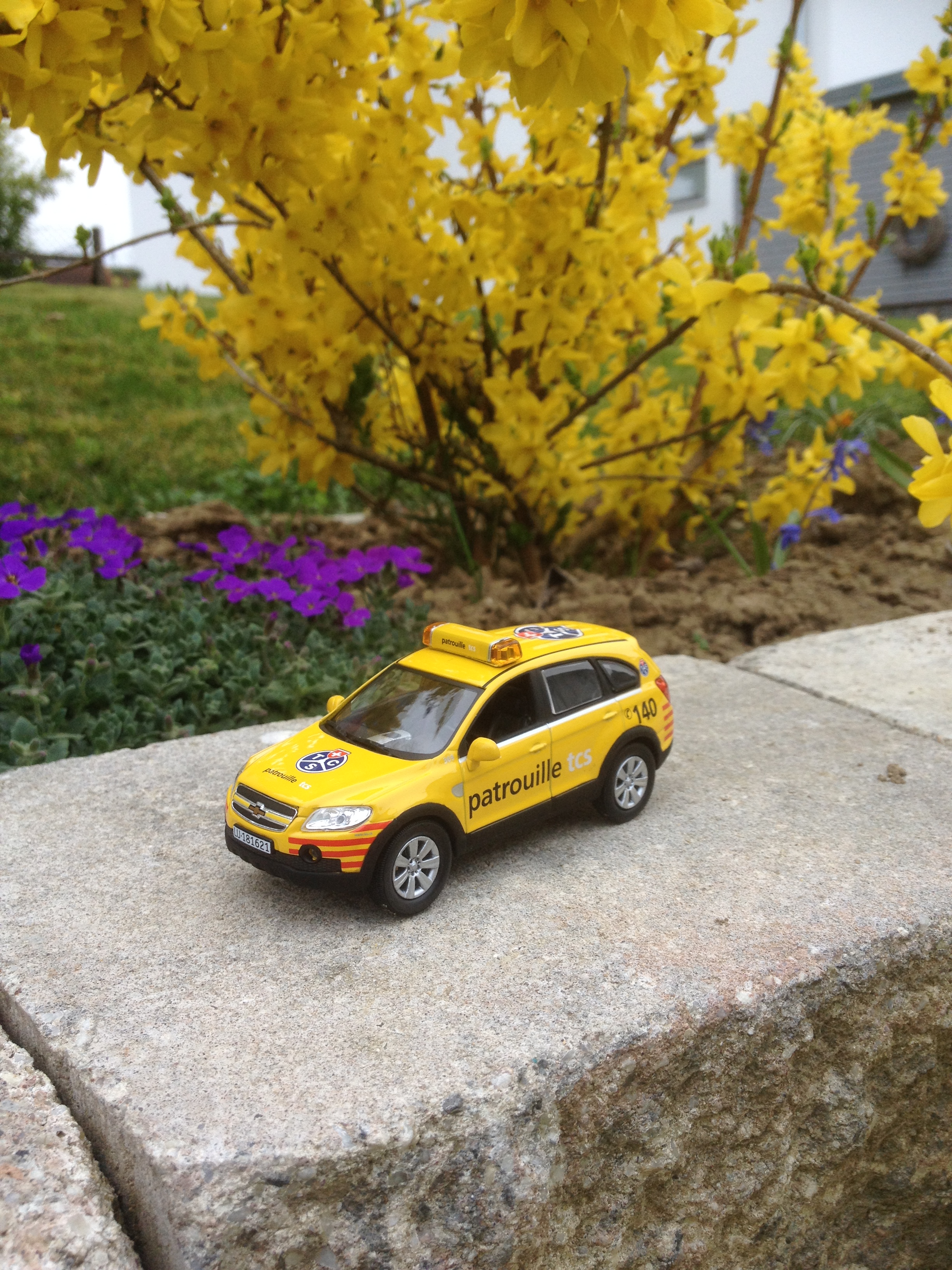Am 15. April 2015 wurde ich von fünf meiner ehemaligen TCS-ArbeitskollegInnen zum Apéro bzw. Abend in Genf eingeladen. Die ideale Gelegenheit für einen Zweitagesausflüg; Mit dem Zug von Altnau nach Schönbühl – Mittagessen mit den Kollegen von dort – dann weiter nach Vernier und weiter im Text. 🙂 Zu meinem Abschied wurde mir eine TCS-Tasche mit allerlei hilfreichen und z.T. essbaren Geschenken übergeben, die mir das Leben bei Onkel Sam erleichtern sollten; Ricola, Bündner Nusstorte (schon gegessen), Kondome (yeah! 😀 ), ein TCS-Sackmesser und… ein Modell des TCS Patrouille Chevrolet Captiva aus dem Hause Norev! Sofort war mir klar, dass auf diesen 4×4 nicht das verstaubte Regal im Schlafzimmer wartete, sondern die big cities und endlosen Weiten seines Heimatlandes USA. Zugegeben, dieses Modellauto wurde in Frankreich entworfen und von einem stolzen Chinesen (der bestimmt nicht viel grösser ist) irgendwo dort im Osten aus einer Maschine gespuckt. But who cares, der Captiva würde die kommenden drei Monate an meiner Seite verbringen und das Land der unbegrenzten Möglichkeiten entdecken. Da Chevrolet Anfang 2013 seinen jahrelangen Slogan “Chevy runs deep” in “Find new roads” umwandelte, war der gelbe Wagen ja geradezu prädestiniert dazu.