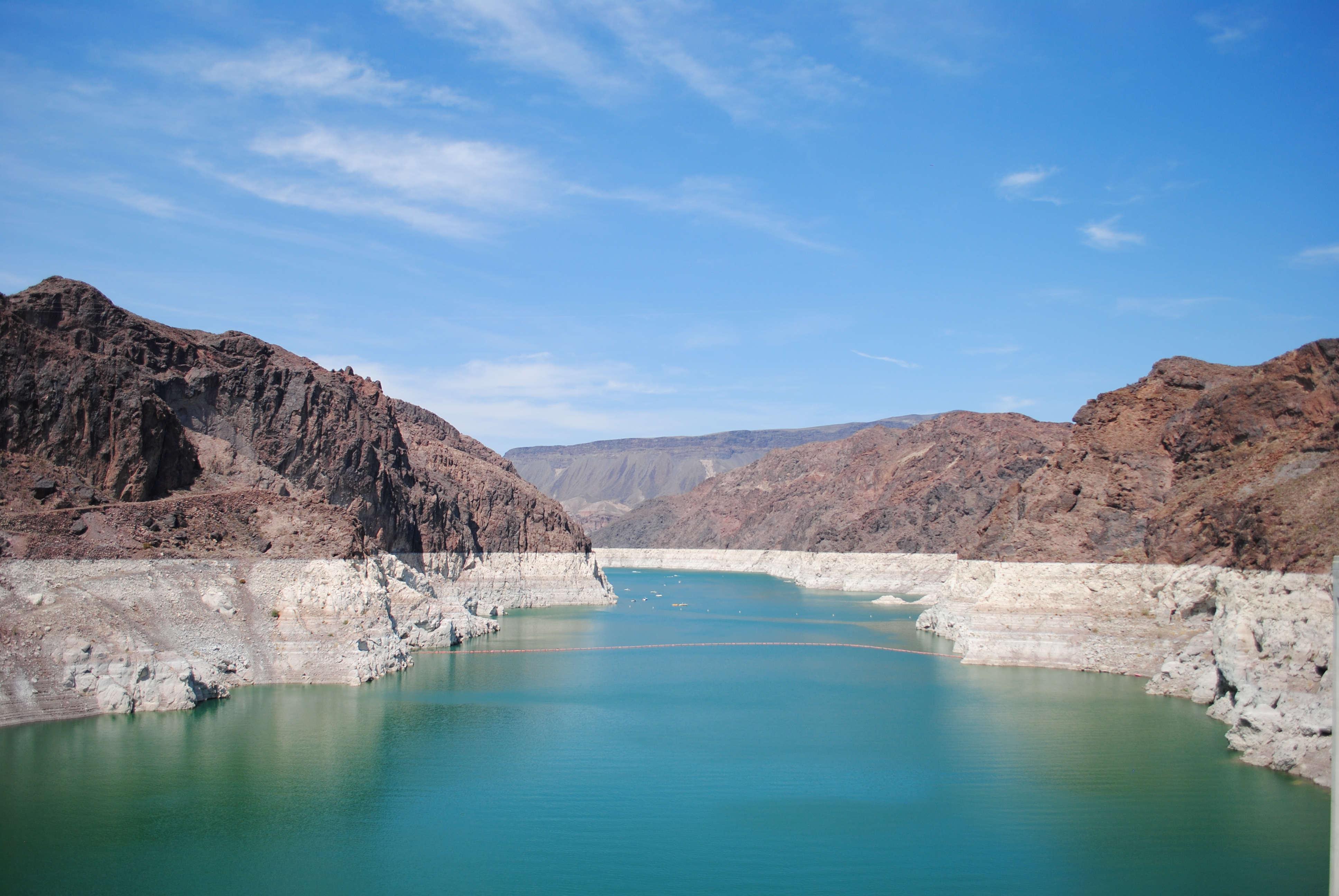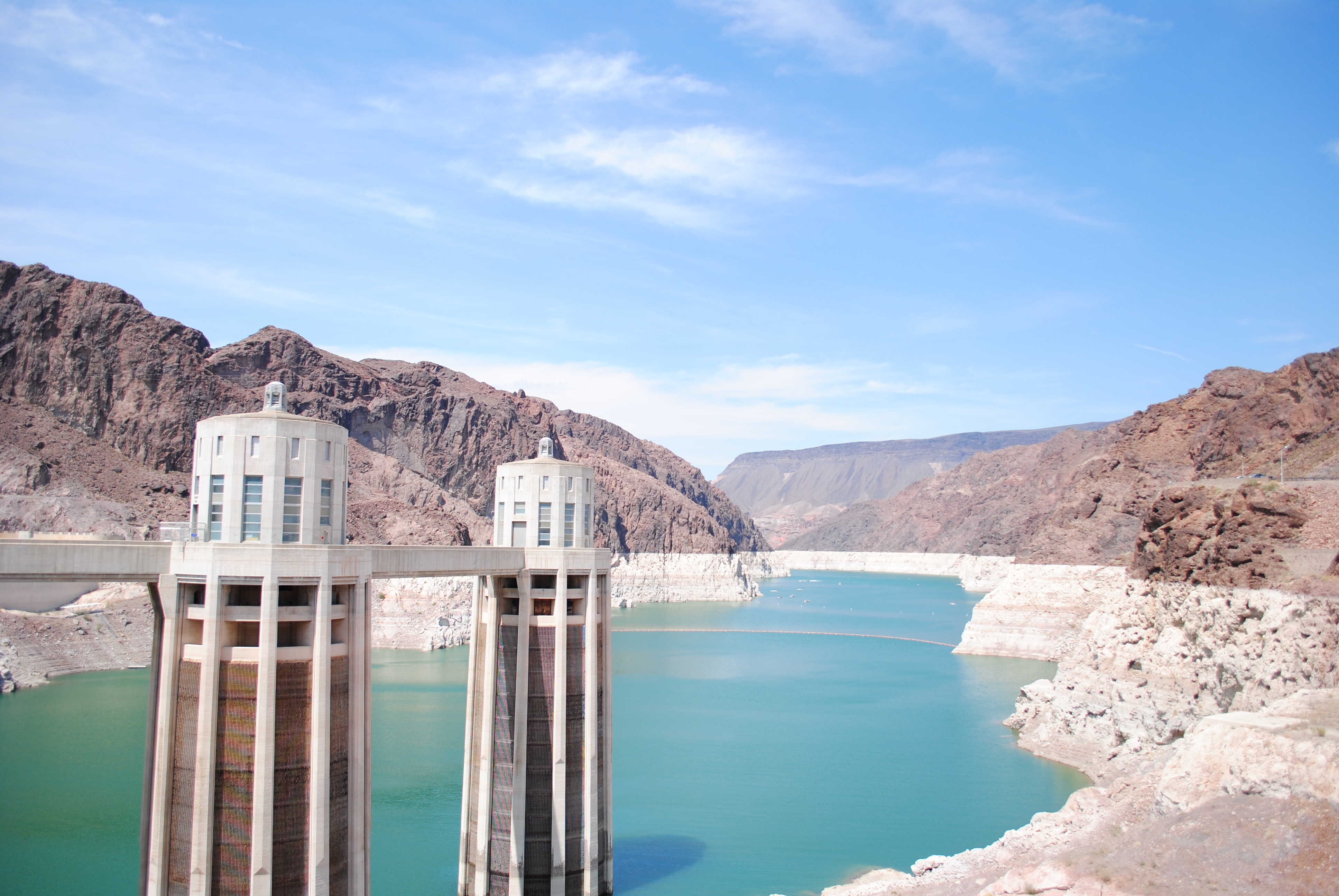 Hoover Dam staut den Colorado River, woraus der Lake Mead entstanden ist. Es ist eines der zahlreichen Wahrzeichen Amerikas und liefert Strom bzw. Wasser für die drei Staaten Arizona, Nevada und California. Jetzt wisst ihr auch woher das Wasser und der Strom für Las Vegas kommen. Kaum zu glauben dass noch etwas für andere Regionen übrig bleibt. 😉